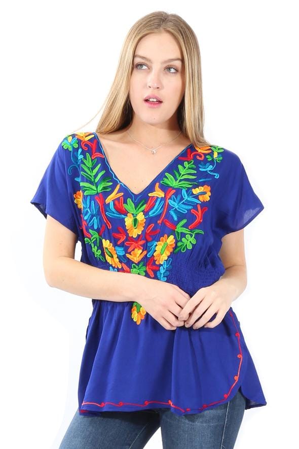 Bordado de flores en colores vivosEscote terminado en "v"Manga cortaResorte en cinturaAbertura a los costadosBajo con bordado.