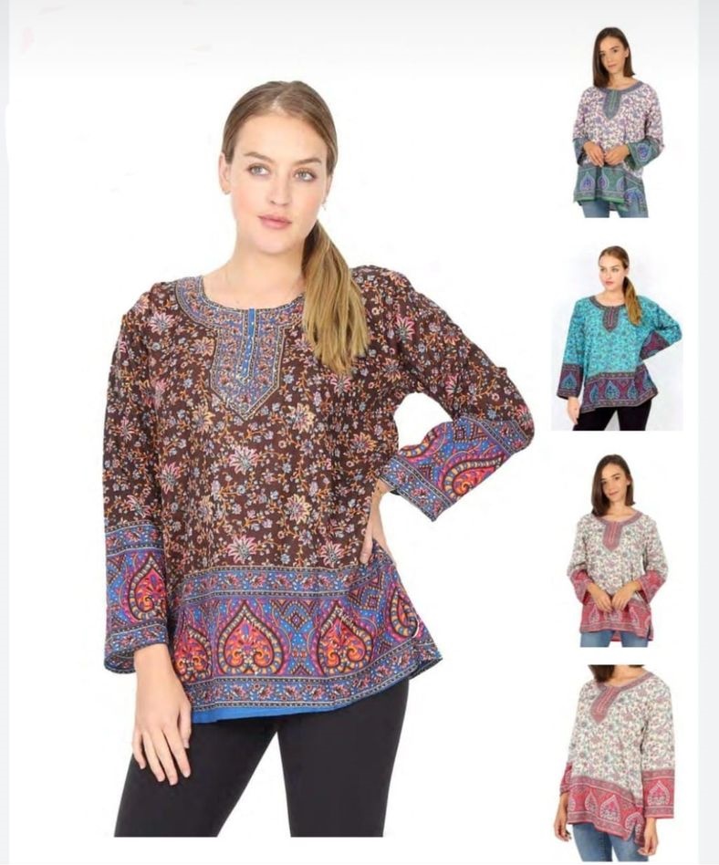 Blusa estampada, coral, turquesa, verde, café.Escote redondoManga 3/4Corte rectoAbertura a los costadosParte trasera a tonoUnitalla